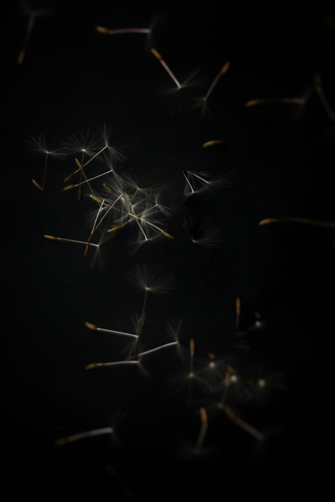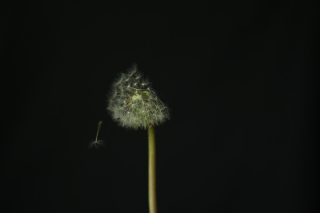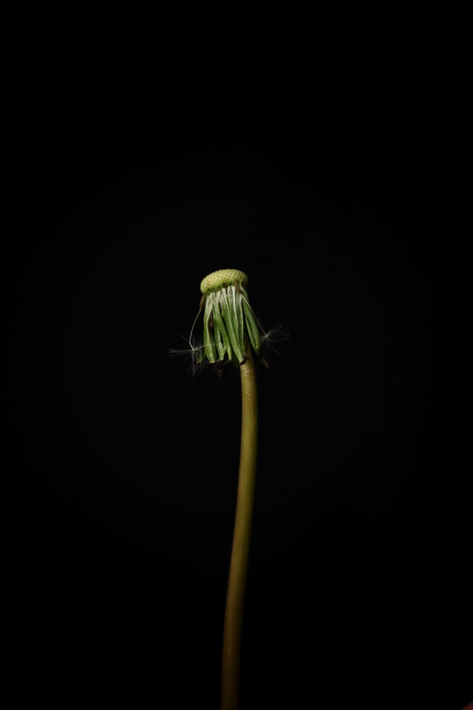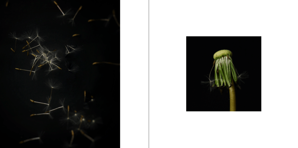 For the first image of the set I layered multiple photos together to represent the movement of the dandelion and how in nature the wind and movement are major factor in the plant loosing its seeds. I then wanted to focus on the detail of the seeds themselves, producing a detail shot of the falling seeds. Instead of photographing the plant at different stages of loosing its seeds, I wanted to use a detail shot to break up the repetitive composition. Finally I shot a simple ‘portrait’ of the plant without its seeds, surrounded by negative space which puts the plant in a venerable place.