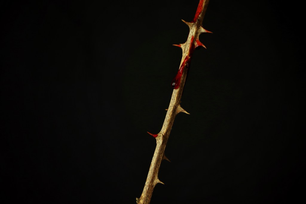 After being inspired by the work of Frida Kahlo, I experimented with the idea of blood and thorns. With the first image in the series I unintentionally formed a ‘cross’ shape when places the thorn which although subtle and maybe not noticeable to most people, links with the religious connotations that I spoke about in the previous post.